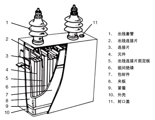 ■ 电容器主要由外壳和心子及出线套管组成,外壳用薄钢板或不锈钢板焊接制成,盖上焊有出线套管,两侧壁上均焊有供安装,吊运的吊攀,心子由元件、绝缘件组成。元件有用聚丙烯薄膜为介质与铝箔(极板)卷制而成或用聚 丙烯薄膜和电容器纸为介质与铝箔卷制而成。